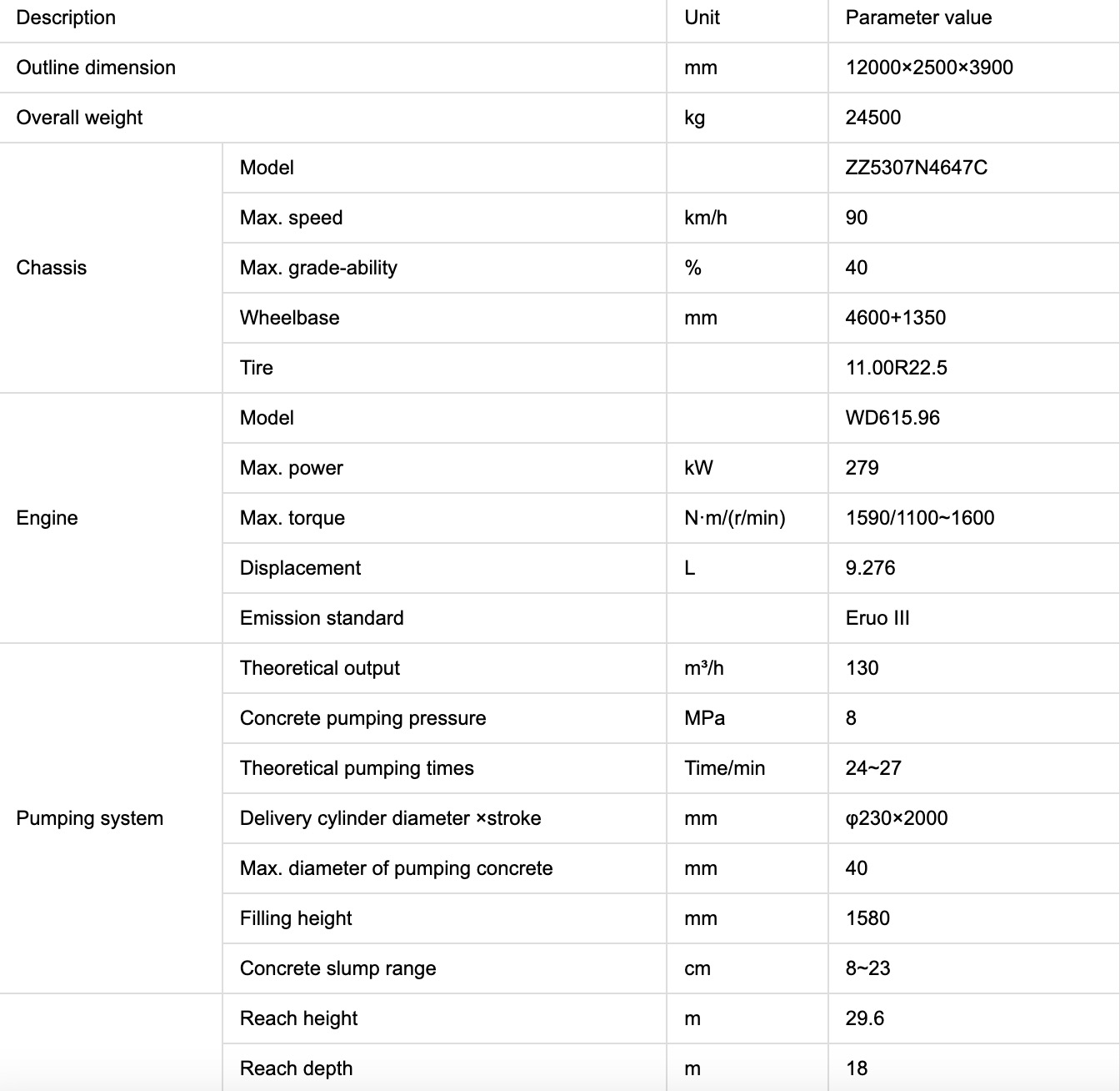 Sany Montued Boom Betonski tovornjak je visokokakovosten tovornjak z betonsko črpalko, ki ga je lansirala Sany Heavy Industry, ki vključuje nemško tehnologijo Putzmeister. Ponaša se z vodilnimi raziskavami in razvojem in proizvodnimi zmogljivostmi v industriji, uporablja napredne proizvodne tehnike in se drži strogega sistema za nadzor kakovosti, da zagotovi, da vsak tovornjak s črpalki zagotavlja izjemno zmogljivost in zanesljivost. Njegov razcvet je izdelan iz visoko trdne zlitine, ki vsebuje robustno strukturo in odlično odpornost proti utrujenosti. Izdelek se pogosto uporablja na različnih področjih, kot so gradnja stavb, komunalni inženiring in gradnja mostu, kar bistveno izboljšuje učinkovitost gradnje in kakovost izlivanja betona.